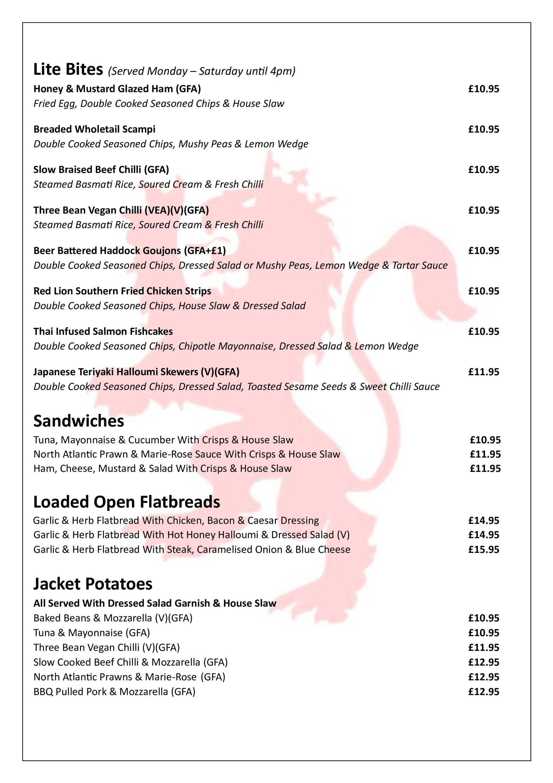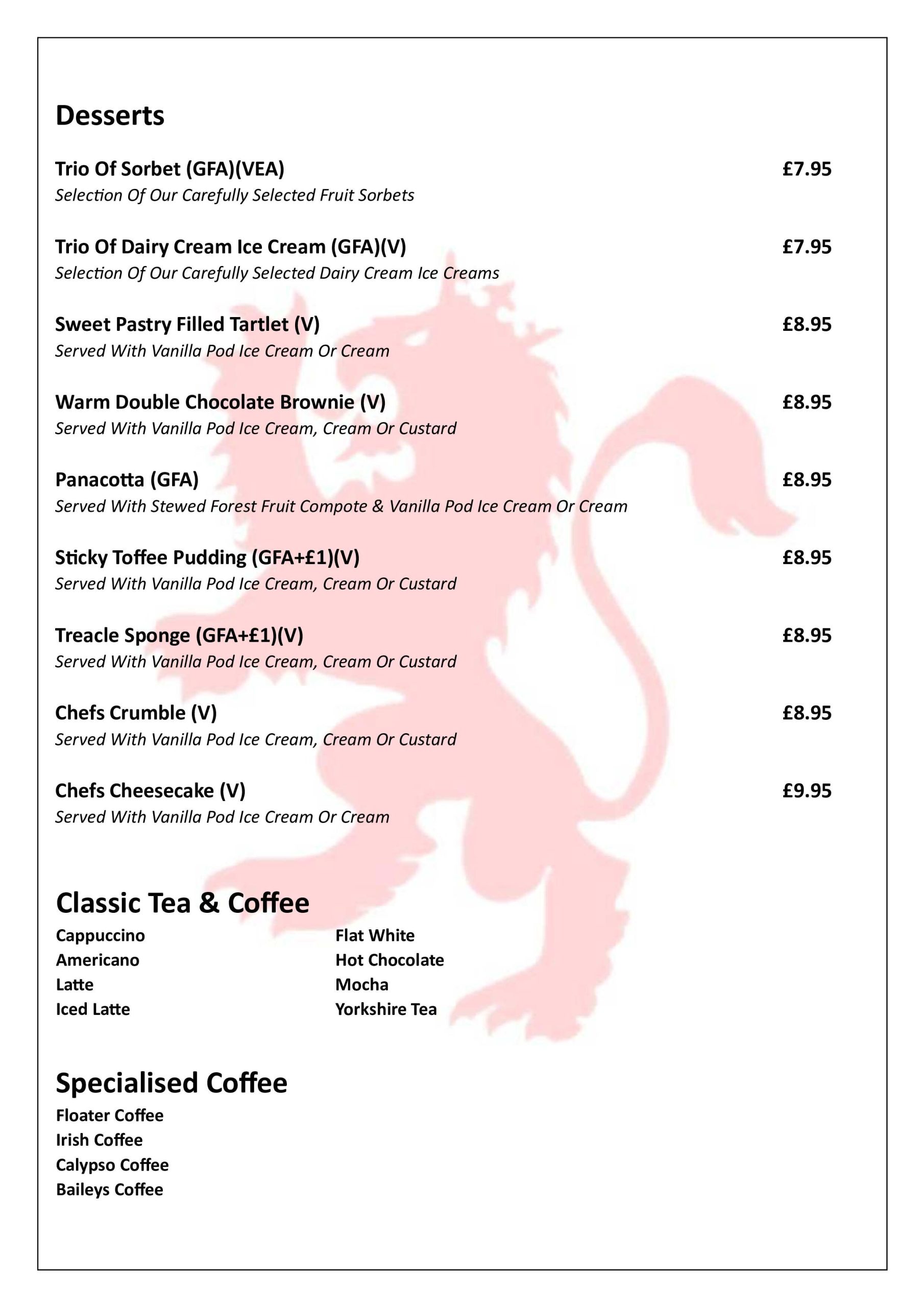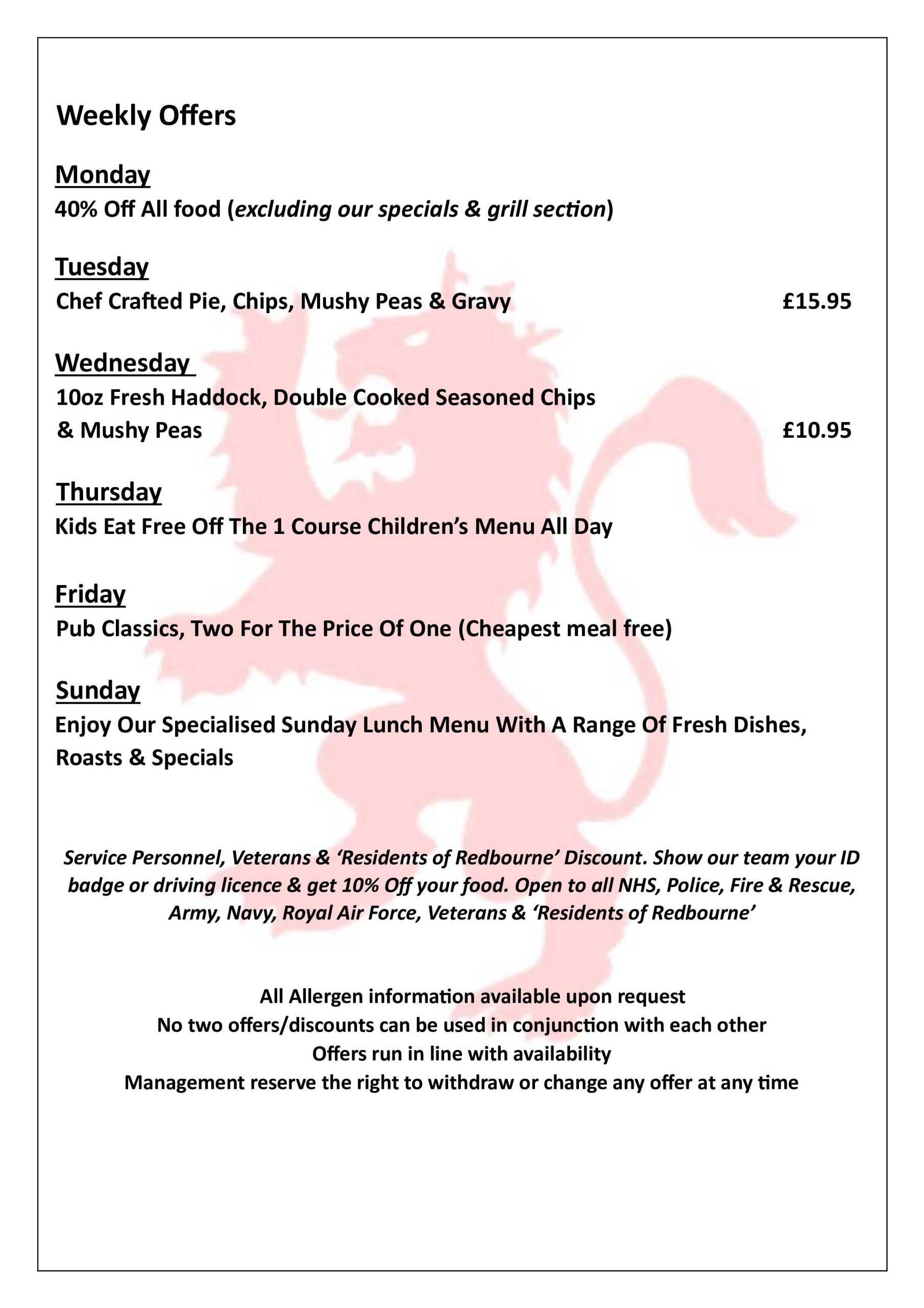 All Allergen information available upon request. No two offers/discounts can be used in conjunction with each other. Offers run in line with availability. Management reserve the right to withdraw or change any offer at any time.
